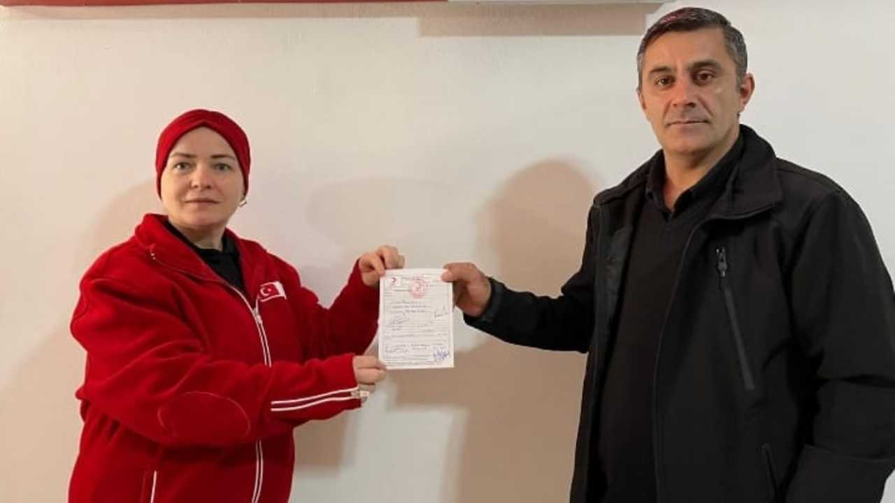 Gölyaka Kapalı Pazaryeri esnaflarından Düzceli Resül Kurt, 11 Ekim Cumartesi günü yaptığı satışlardan elde ettiği kâr gelirini Filistin halkına yardım etmek üzere Düzce Kızılay Şubesi yetkililerine makbuz karşılığında teslim etti.