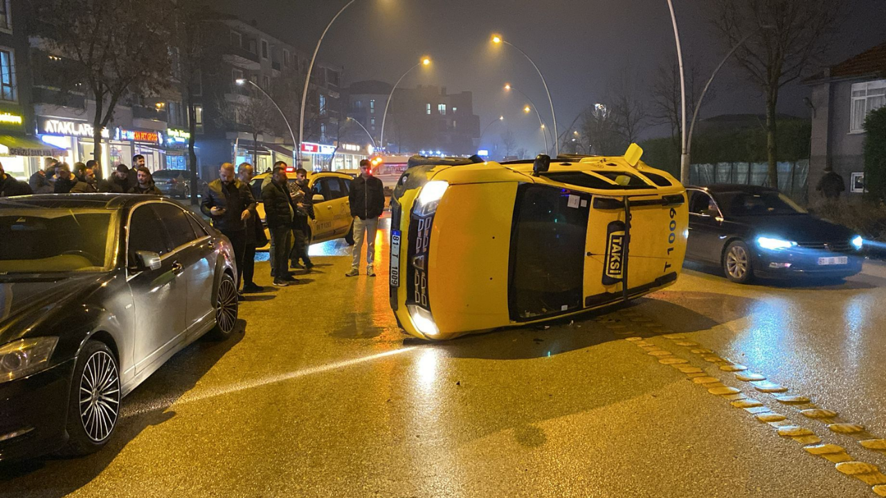 Düzce’de kontrolden çıkan ticari taksinin park halindeki otomobile çarparak devrildiği kazada, sürücü şans eseri yaralanmadı.