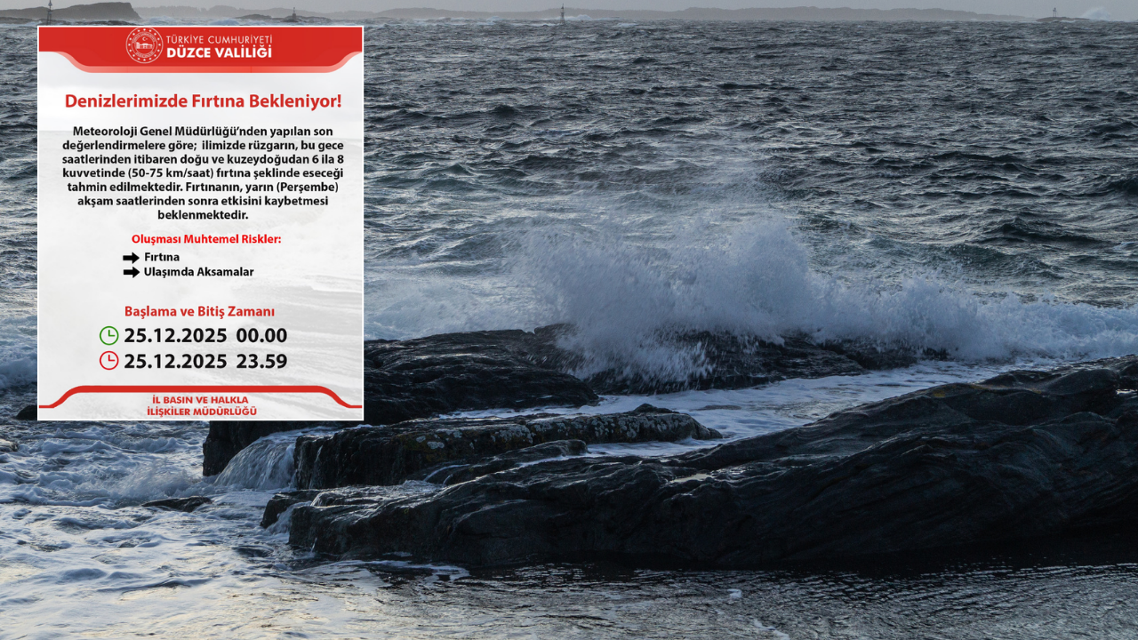 DMHA DÜZCE-Düzce Valiliği tarafından paylaşılan bilgilere göre, rüzgârın bu gece saatlerinden itibaren doğu ve kuzeydoğu yönlerden 6 ila 8 kuvvetinde (50–75 km/saat) fırtına şeklinde eseceği tahmin ediliyor.Fırtınanın, 25 Aralık Perşembe günü akşam saatlerinden sonra etkisini kaybetmesi bekleniyor. Yetkililer, fırtına nedeniyle deniz ulaşımında aksamalar yaşanabileceğini belirterek, özellikle balıkçılar ve denizcilerin dikkatli ve tedbirli olmaları çağrısında bulundu.Oluşması muhtemel riskler arasında fırtına ve ulaşımda aksamalar yer alırken, vatandaşların resmi uyarıları takip etmeleri istendi.