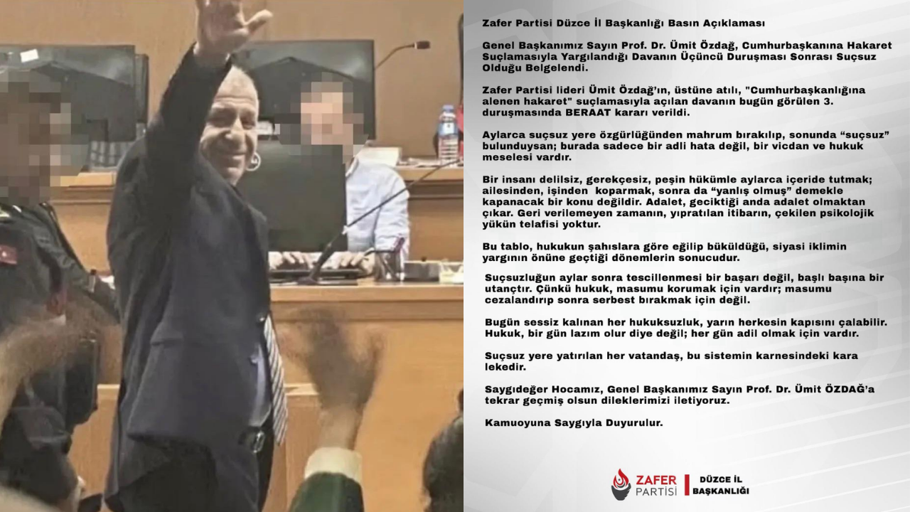 Zafer Partisi Genel Başkanı Prof. Dr. Ümit Özdağ’ın, “Cumhurbaşkanına alenen hakaret” suçlamasıyla yargılandığı davanın bugün görülen üçüncü duruşmasında beraat kararı verildi. Kararın ardından Zafer Partisi Düzce İl Başkanlığı yazılı bir basın açıklaması yaparak sürece ilişkin değerlendirmelerde bulundu.