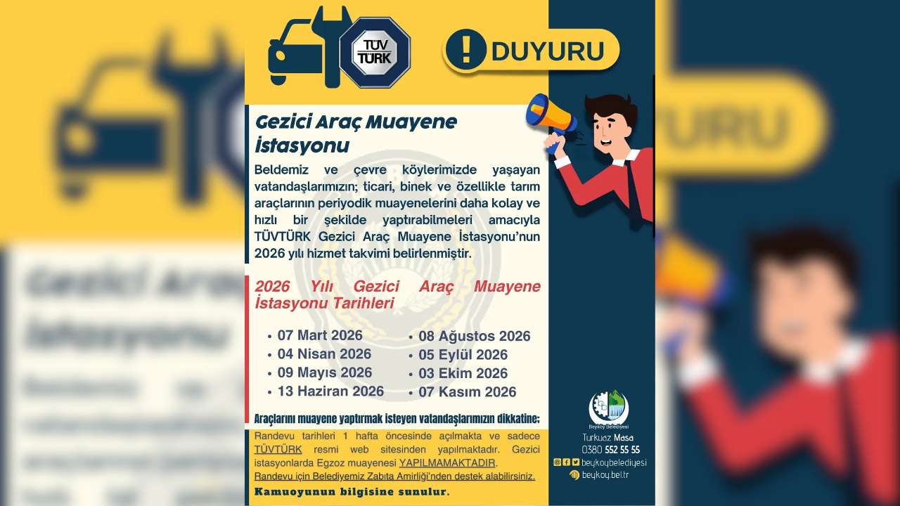 Beyköy Belediyesi, belde merkezi ve çevre köylerde yaşayan vatandaşların araç muayenelerini daha kolay yaptırabilmesi amacıyla TÜVTÜRK Gezici Araç Muayene İstasyonu’nun 2026 yılı hizmet takvimini duyurdu.