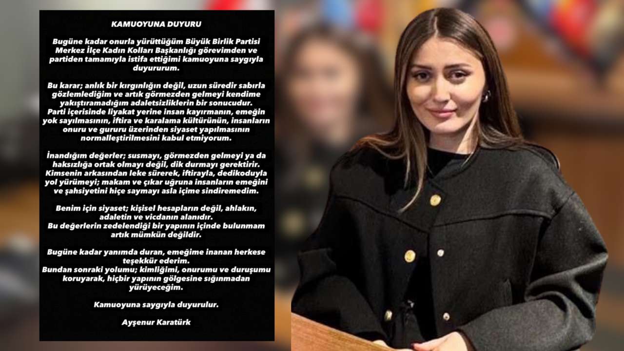 Büyük Birlik Partisi Merkez İlçe Kadın Kolları Başkanı Ayşenur Karatürk, görevinden ve partisinden istifa ettiğini kamuoyuna duyurdu.