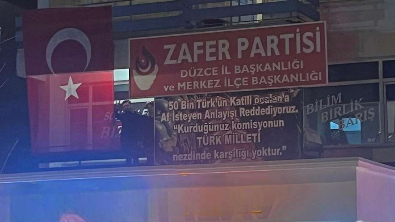 Zafer Partisi Düzce İl ve Merkez İlçe Başkanlığı, terörist başı Abdullah Öcalan’a af talebini gündeme getiren anlayışa karşı pankart asarak tepki gösterdi.