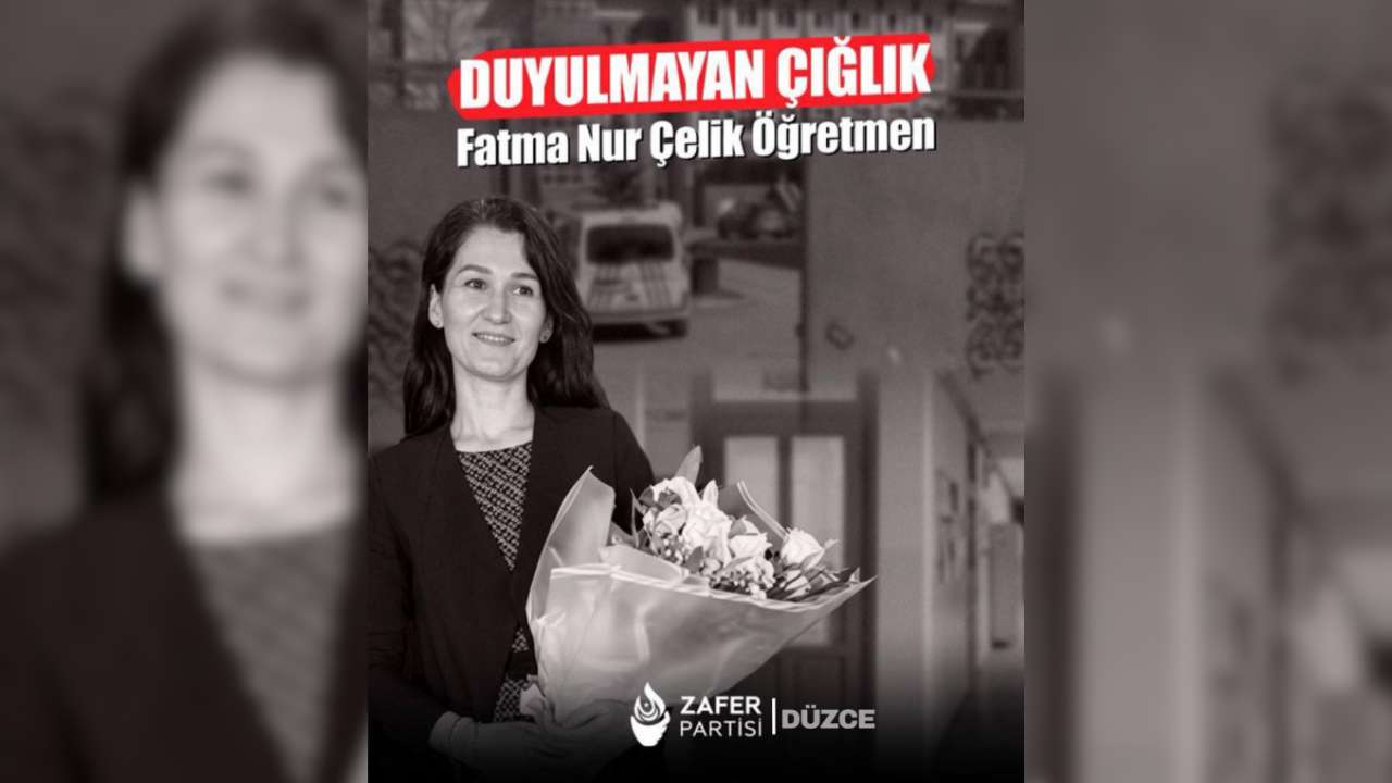 Zafer Partisi Düzce İl Başkanı Hülya Eroğlu, Çekmeköy’de görev başında hayatını kaybeden öğretmen Fatma Nur Çelik’in acısını paylaştı ve öğretmenlerin can güvenliğinin devletin ertelemeyeceği asli sorumluluğu olduğunu vurgulayarak basın açıklaması yaptı.